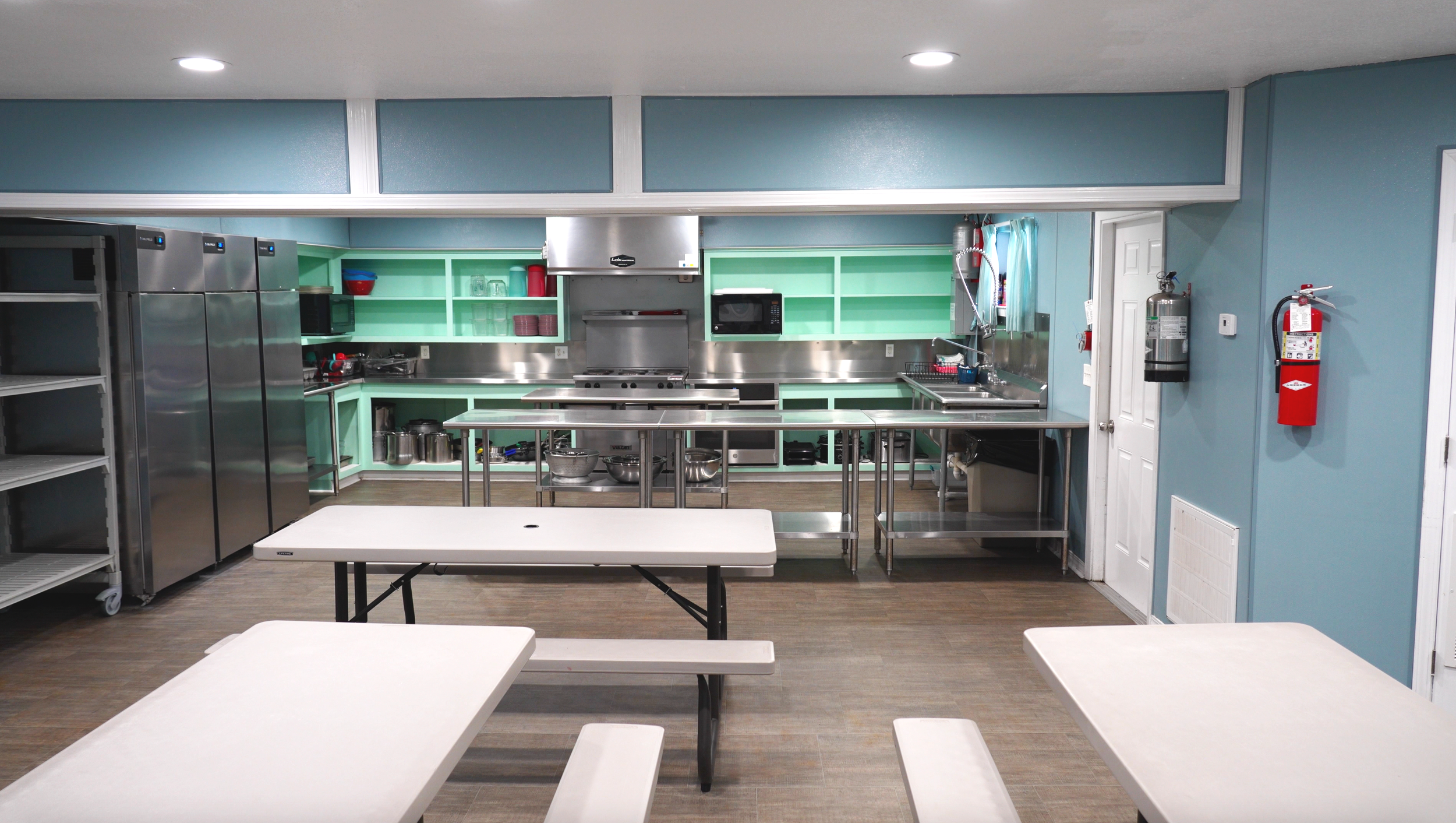 Commercial Kitchens: Teams love our fully-equipped commercial kitchens with Vulcan commercial stoves, Delfield commercial refrigerators, 24-quart stock pots, and everything from roaster pans to serving trays, making it easy to prep cost-effective, nourishing meals together.