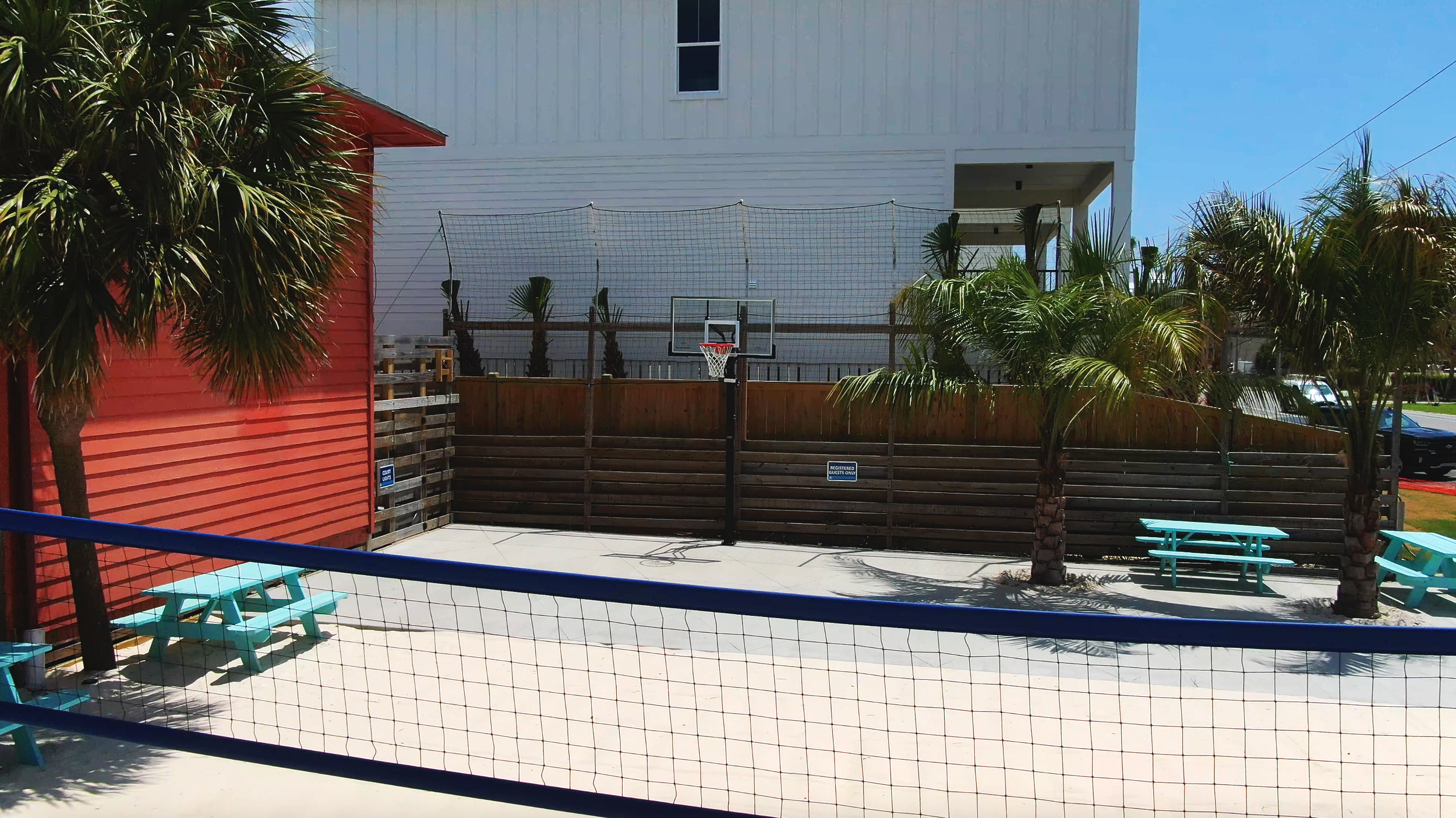 Sand volleyball courts, basketball courts, and outdoor gathering areas